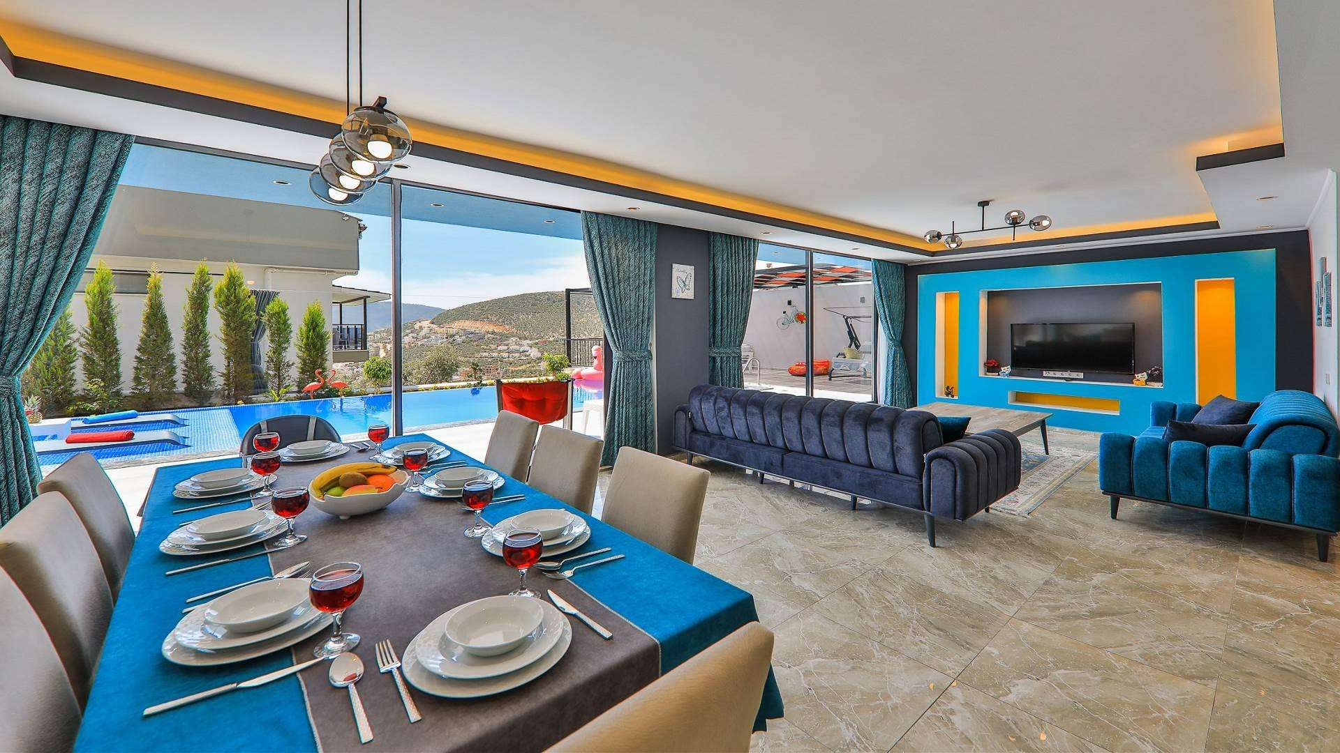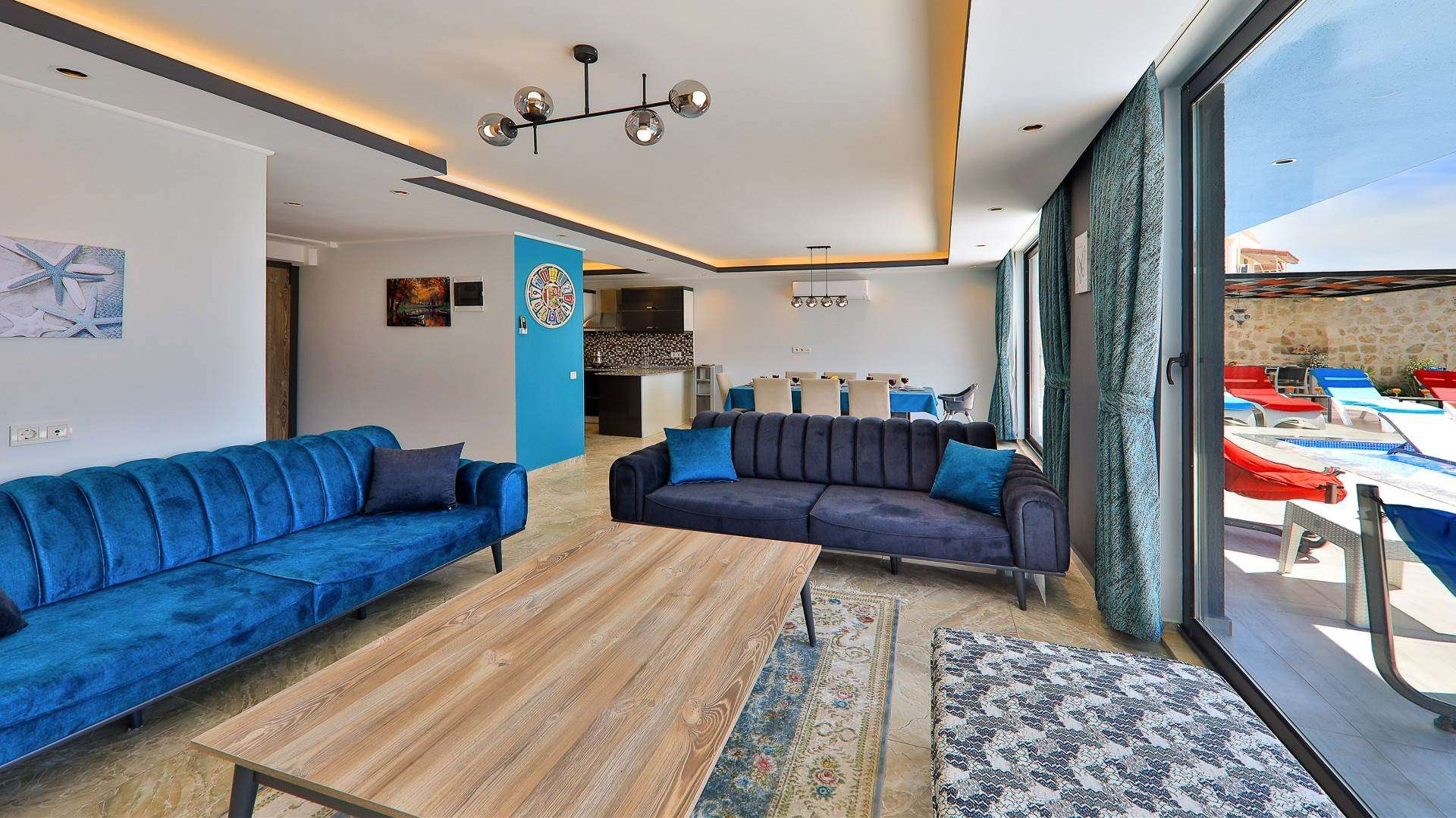 Detayları : Oturma grubu, Uydu TV (LCD), 10 Kişilik yemek masası, Wc - Banyo ,Klima, Havuz terasına çıkış bulunmaktadır.