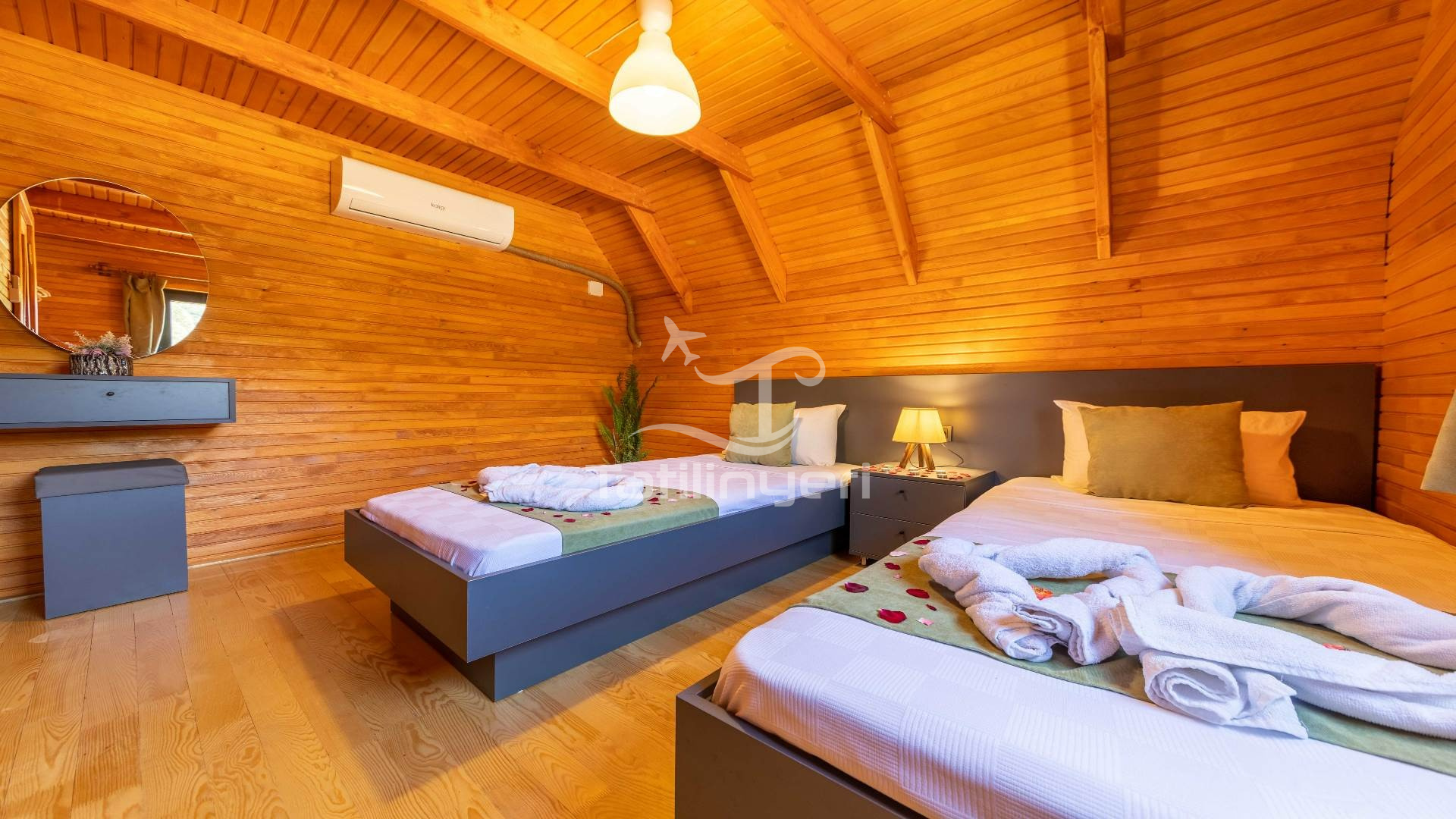Not: Villamızda 1 adet tuvalet banyo bulunmaktadır alt katta salonda bulunmaktadır ,alt katta 2 tane tekli yatak ,üst katta 1 tane çift kişilik yatak bulunmaktadır.